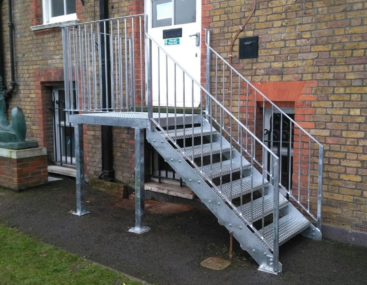 Fire escape stairs are engineered for emergency access, typically installed in commercial buildings, and designed to withstand harsh outdoor conditions. Fully compliant and built for safety.